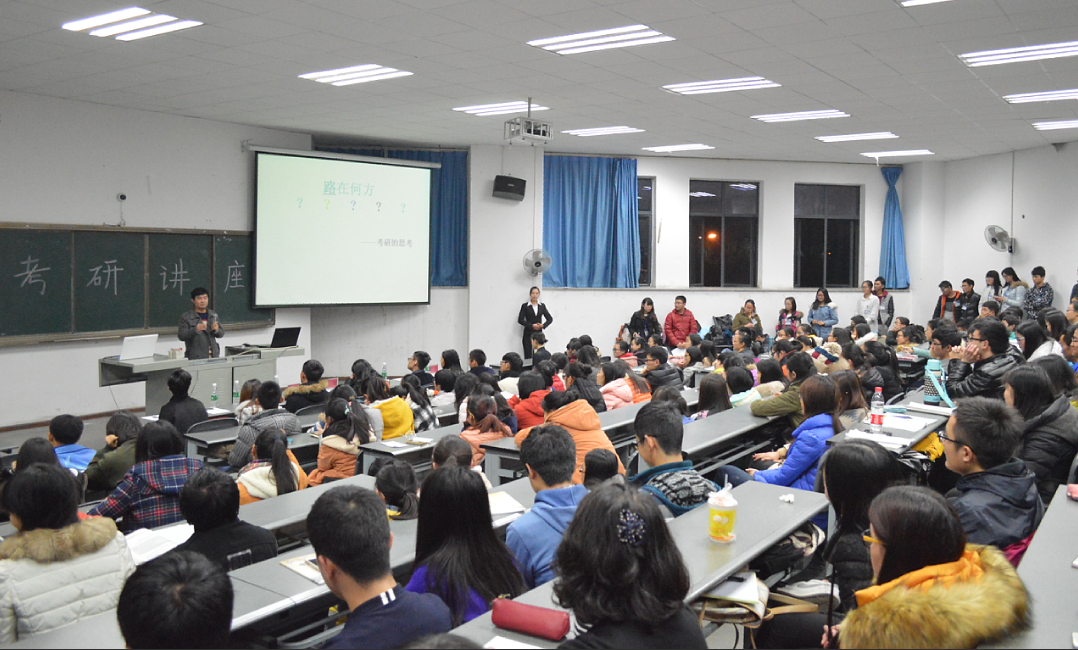 王广科老师首先就为什么考研、考研的意义、各用人单位的基本要求展开,鼓励同学们能够继续学习为将来更好的就业打下基础;接着分析了当今考研的政策、近年来几所高校的考研数据,帮助同学们认清当前的考研形势;然后从如何择校、如何查找相关资料、合格研究生应具备的素质等方面进行分析,还传授了他自己潜心研究多年的宝贵经验以及考研策略,希望同学们能够刻苦努力,打下扎实基础,为自己的未来打拼。王老师的语言风趣,内容贴近生活,案例丰富,台下观众常常报以阵阵掌声和笑声。提问时间,同学们纷纷把握时机踊跃提问,研究生答疑团针对在场同学的疑问一一详细回答,同学们都表示受益匪浅。