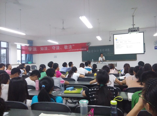 江先文从十八届四中全会的会议精神出发,结合法律协会前期在校园内收集并整理的大学生关心的法律问题、困惑的法律难题,通过经典案例和师生互动,阐述了大学生法治思维意识培养的重要性和途径,希望同学们通过学习法律知识,参与法律实践,不断增强法治意识。然后结合“国家宪法日”,以“弘扬宪法精神 维护宪法权威”为主题,组织同学们学习了国家根本大法《宪法》的主要内容,将《宪法》的基本框架生动形象地呈现在同学们面前。整个讲座活动井然有序,气氛活跃。