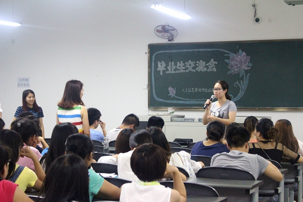 日前,人文信息管理学院毕业生经验交流会在B301教室举行,来自公共事业管理专业的毕业生梅彩悦、冯亚莉和信息管理与信息系统专业的毕业生廖德兵、何鑫与学弟学妹们进行面对面交流,辅导员罗艳荣老师参加了交流会。