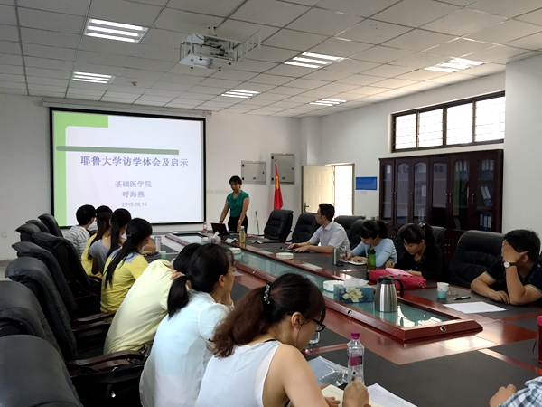 6 月10日 下午,基础医学院举办了首次“访学论坛”。论坛邀请了从美国耶鲁大学访学归来的呼海燕教授,就访学期间的科研工作、学习收获和心灵感悟等进行了交流和分享。论坛由杨平副院长主持,学院无课的青年教师培训计划参训人员出席了本次论坛交流。
