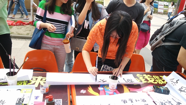 在活动的现场,同学们观看了当年五四运动的历史图片、优秀青年人物事迹和一些励志名言的书法展。此外,还设置了书法临摹环节,桌上摆放着毛笔和宣纸,同学们挥毫泼墨,临摹“豪情壮语”,在这些图片和书法的影响下,满怀着激情和对未来的期望写下了自己的志向,并坚定地粘贴到展示栏里。现场气氛非常活跃,同学们临摹的书法随风飞扬,洋溢着强烈的青春气息。