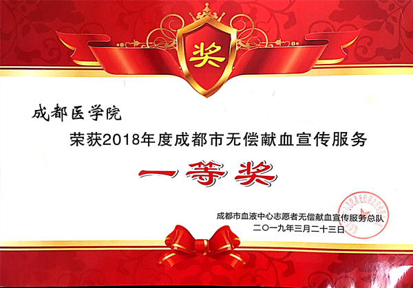 3月23日,在成都市血液中心举办的成都市无偿献血宣传服务队第二十八次联系会暨培训评估会上,我校荣获2018年度成都市无偿献血宣传服务一等奖。