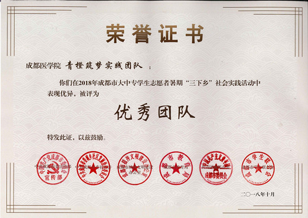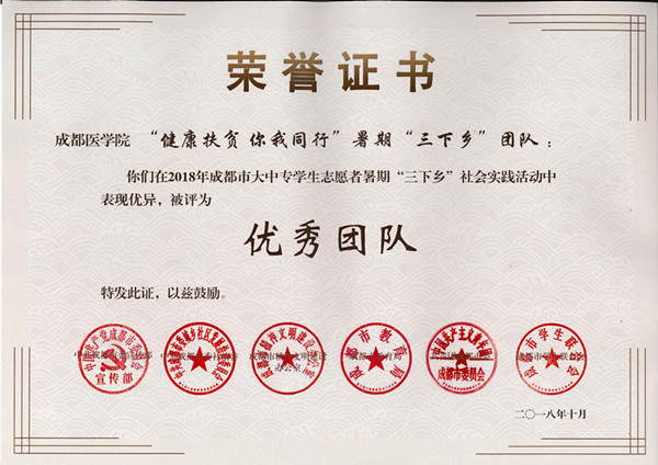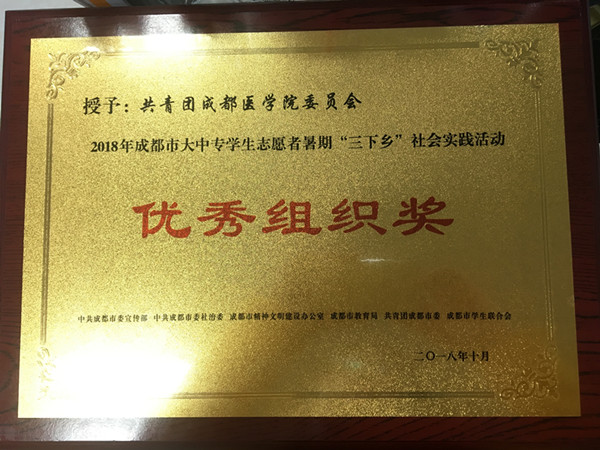 为深入贯彻落实习近平总书记来川视察重要讲话精神,围绕成都建设全面体现新发展理念的城市这一目标,成都市委宣传部、市委社治委、市文明办、市教育局、团市委、市学联于成都大学组织开展了2018年成都市大中专学生志愿者暑期“三下乡”社会实践活动工作总结会,学校“健康扶贫,你我共行”暑期“三下乡”团队、青橙筑梦实践团队荣获“优秀团队奖”,彭阳、任亮两位老师荣获“优秀指导教师奖”,校团委荣获“优秀组织奖”。
