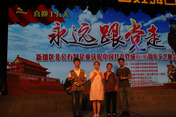 6月29日晚,受共青团新都区委邀请,校团委老师带领李朝阳、谢怀超、余樊和任梓静四位同学参加了新都区百姓大舞台新都区非公经济企业庆七一专场文艺晚会,同学们表演了我校师生自编自演的舞台剧《医者仁心》,在七一前夕代表我校给学校驻地新都区众多企事业单位职工和广大父老乡亲呈现了一出感人至深的节目。