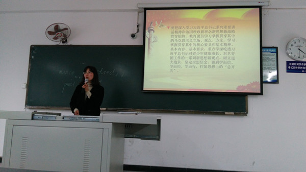 本次团课分四个阶段进行,首先由李老师给我们展示了中国共产主义青年团团旗,团徽以及团员证;课中,叶涛同学用铿锵有力的声音唱中国共青团团歌,一度将课堂氛围渲染到极致;随即老师又从共青团的历史发展、性质、任务,共青团员的权利和义务进行生动的诠释;最后总结了作为一名优秀的共青团员应该具备的条件及做法,学习习近平总书记的理论,加强自身素质培养。
