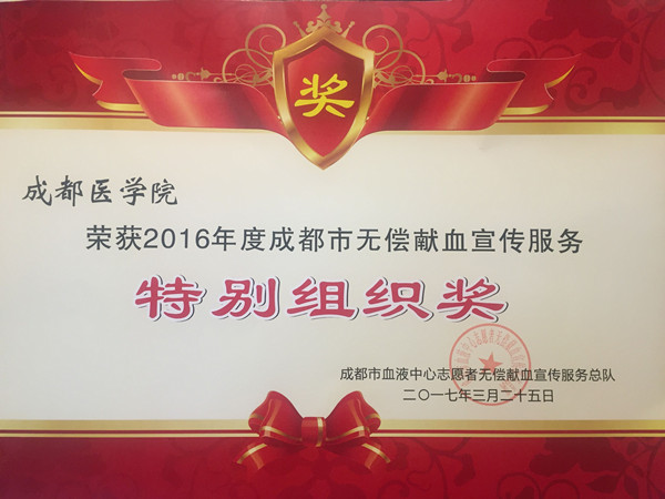 3月25日,我校献血宣传队队长余河林同学代表我校参加了成都市血液中心组织的无偿献血宣传服务队第二十四次联系会暨评估总结会,会上成都市血液中心对2016年度成都市无偿献血志愿服务工作中取得优异成绩的单位进行了表彰,我校无偿献血宣传服务队荣获特别组织奖。特别组织奖每年仅评定两所高校,是市血液中心对过去一年成都市几十所高校及社会志愿者的最高表彰。