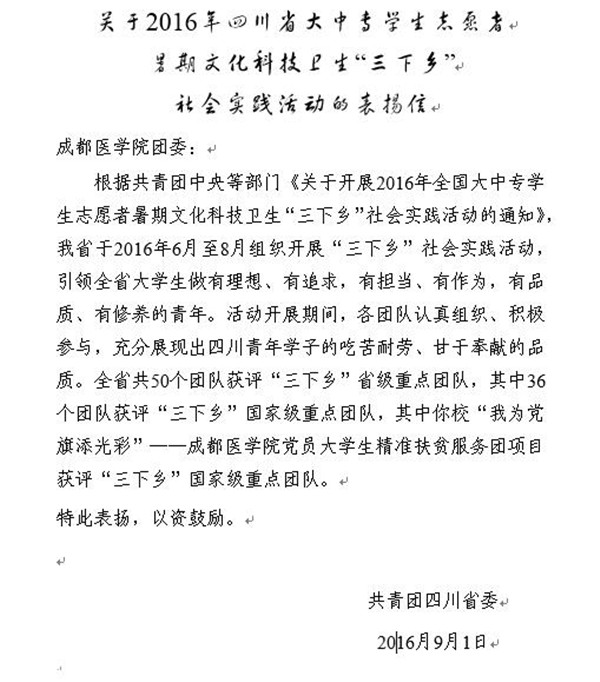 近日,共青团四川省委向我校团委发来表扬信,对我校“我为党旗添光彩”——成都医学院党员大学生精准扶贫服务团项目获得团中央评定的国家级“重点团队”称号予以表扬。