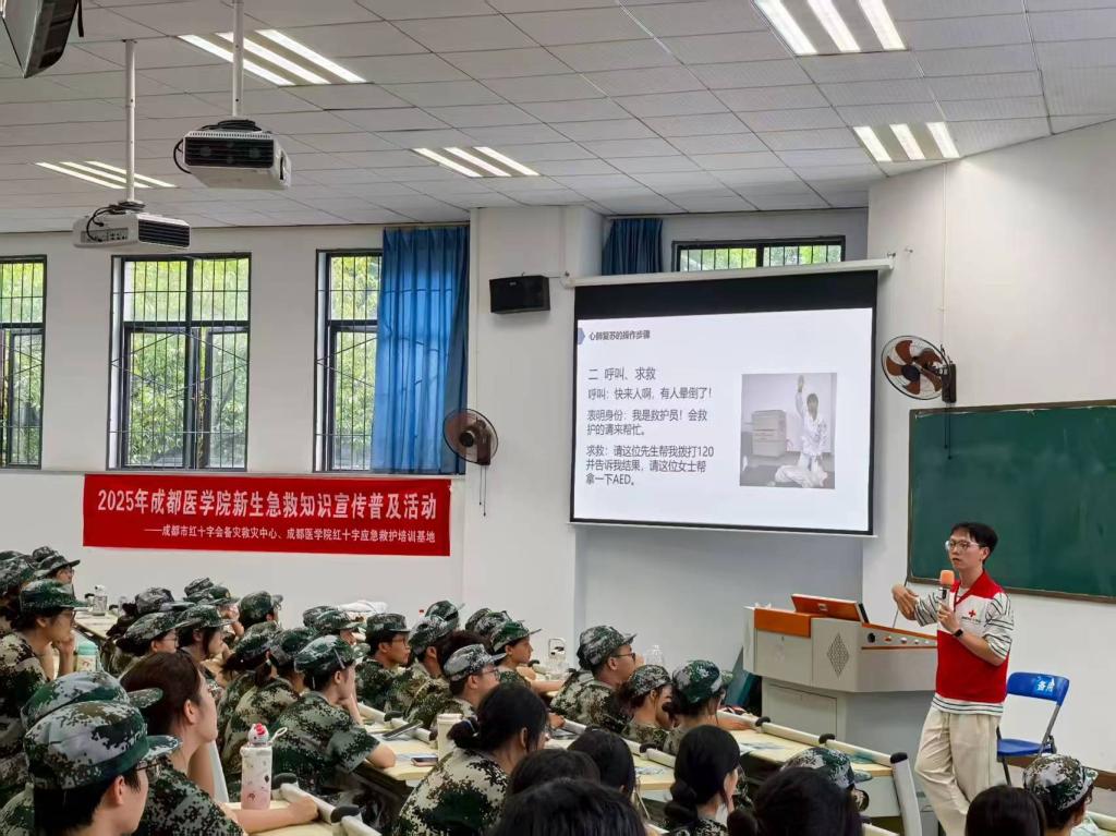 活动中,成都医学院急救协会骨干们结合军训高强度训练特点,以“理论讲解+实操演示”的形式,聚焦三大核心急救场景展开教学。培训现场,校团委任亮老师首先带领新生回顾红十字运动历史。从1863年亨利·杜南发起成立“伤兵救护国际委员会”,到如今红十字组织成为全球最大的人道救援网络,讲师通过简短案例,让新生理解“保护生命与健康”的红十字宗旨,激发大家学习急救知识的责任感。