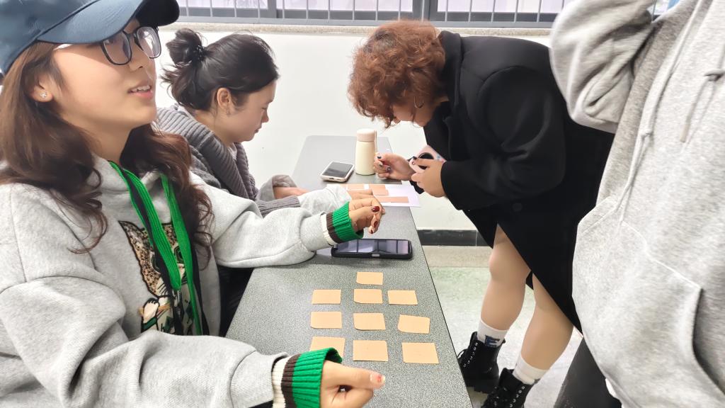 活动开始前,志愿者开展了1到9盲文数字的识别以及盲文字母的辨认教学。教学完成后,参与者从志愿者处领取盲文板、盲文笔和牛皮纸卡片,每人随机打出一个字母,最终众人齐心协力拼出一句激励人心的话语。随后,志愿者拿出1到9的盲文扑克牌,参与者在闭眼状态下随机抽选一张,通过触摸准确说出牌上的盲文数字后即可获得一个小巧的盲袋作为奖励。参与者们用指尖“阅读”盲文内容,切身感受到了盲人通过触觉感知世界的独特方式。这一体验不仅让参与者们对盲人的生活有了更直观的认识,也深刻体会到了盲文背后蕴含的对平等与尊严的追求。