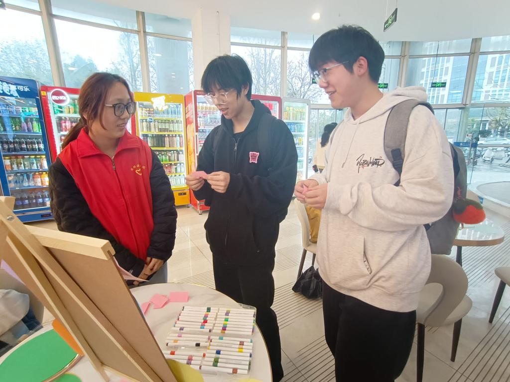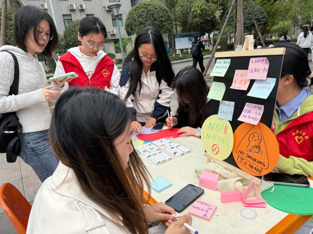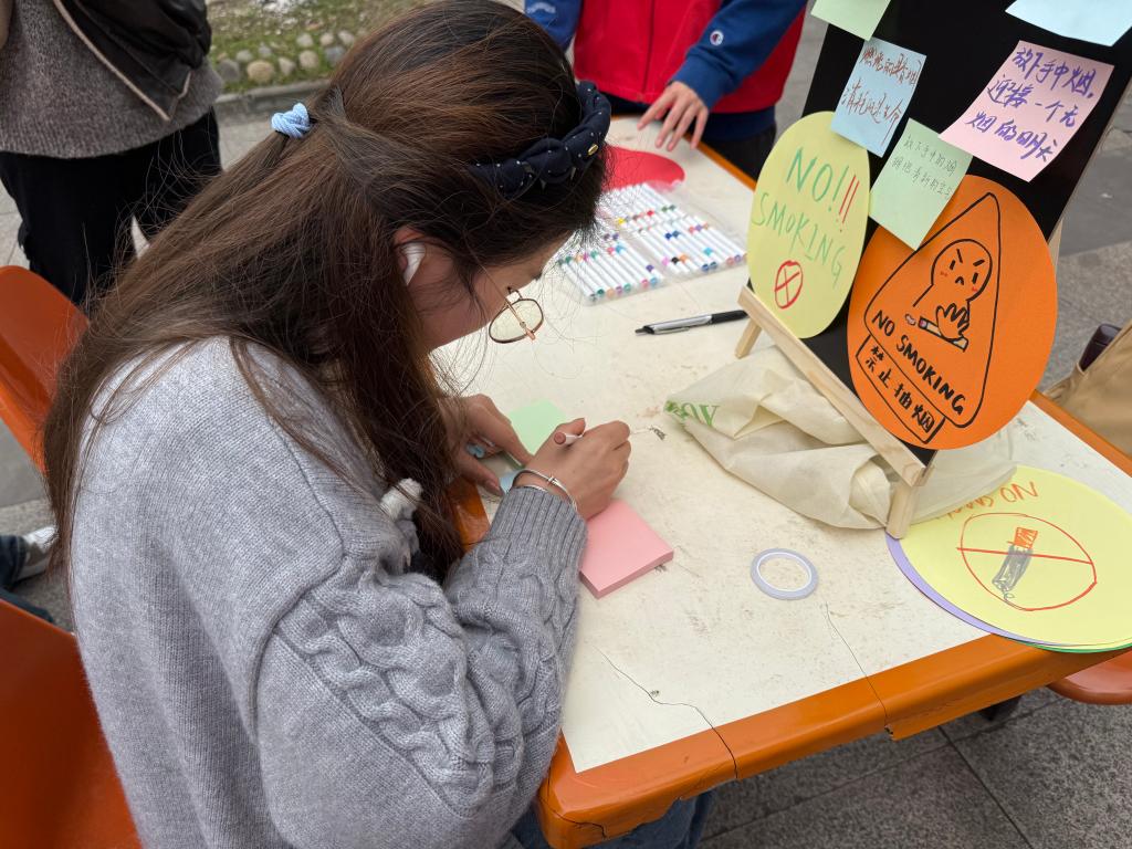 活动以趣味互动与知识科普相结合的形式展开。在禁烟挑战环节,同学们通过抽签随机领取任务,完成绘制禁烟标志、说出禁烟宣言等实践内容。活动还设置了圆片涂鸦创作与留言板交流两个板块。同学们用彩笔在圆片上绘制禁烟主题图案,将艺术表达与健康理念相融合。留言板上,大家纷纷书写禁烟倡议、吸烟危害警示语或对戒烟者的鼓励话语,字里行间流露出对无烟校园的期待与支持。在动手与表达的过程中,同学们不仅加深了对烟草危害的认知,也在互动中增强了自我健康管理的意识。禁烟理念在潜移默化中深入人心。
