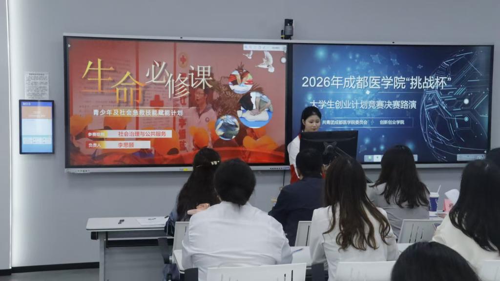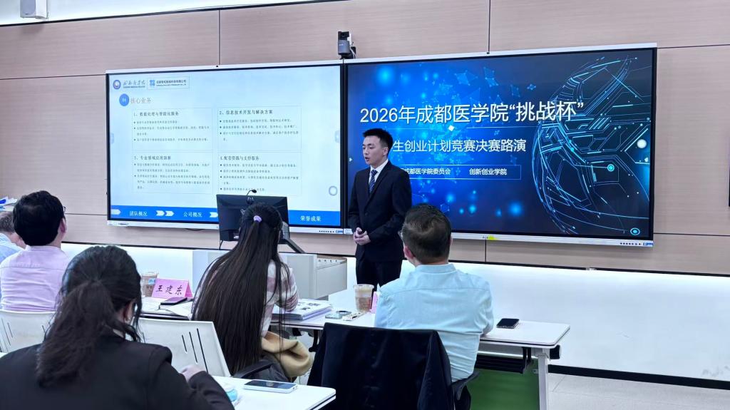 以创新之名,赴青春之约。4月9日下午,由校团委与创新创业学院联合主办的2026年成都医学院“挑战杯”大学生创业计划竞赛决赛路演在新都校区多功能厅正式举行。校团委与创新创业学院联合主办本次活动,30支晋级团队共同见证这场青春与创意的碰撞。