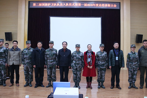 国旗护卫队成立一年多来,多次在学校重大活动亮相,表现突出,获得了一致好评。经学校批准对4名表现优秀的骨干及队员进行表彰,团委书记彭成静宣读了《关于表彰第一届国旗护卫队优秀骨干及优秀队员的通报》,出席大会的领导们为受表彰同学颁发了奖状。