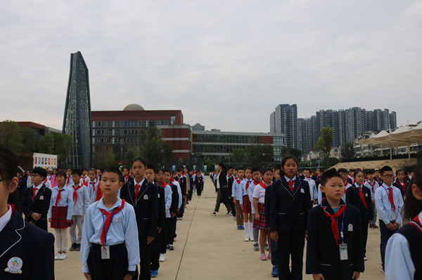 高亢激昂的国歌响起,旗手流畅地撒旗,五星红旗迎着朝阳冉冉升起,国旗下,少先队员高举右手,眼神坚毅,胸前的红领巾迎风飘扬!