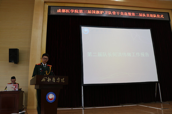 铁打的国护,流水的兵。会议在庄严的国歌声中进行到老队员退队表彰部分。第二届队长何洪伟对于国旗护卫队这一年的建设发展工作做了详细的报告。他表示:国旗护卫队在学校领导和老师们的亲切关怀与大力支持下取得了今天的成绩,希望新一届的队员们接下队伍荣誉的同时扛起责任,让成医国护队持续发展。