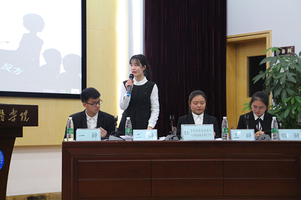 比赛开始,正反双方一辩同学各自阐述了本方观点,正方认为手机的普遍使用给人们以及大学生的生活、学习带来了便捷,同学们可以运用手机了解更多资讯、学习更多知识。反方一辩则抛出了大量数据说明手机的普遍使用给大学生成才带来的弊端。接着,双方二辩分别列举了大量事例用以证明本方观点。质辩环节,反方三辩向对方辩手连发三问,并拿出在校内拍摄的同学们使用手机的照片证明对方观点的漏洞。双方立场坚定,这场没有硝烟的战争愈演愈烈,现场观众不时爆发出阵阵掌声。